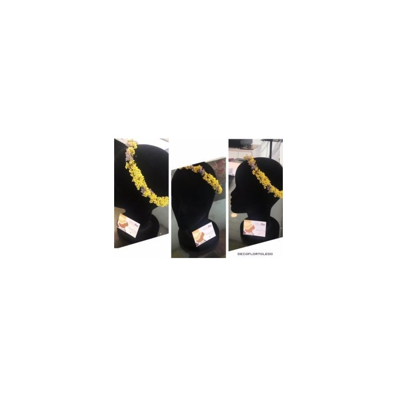 Esta pieza de nuestra colecci de joyer floral es perfecta para una boda o cualquier evento importante en el que desees lucir una pieza exclusiva, natural y duradera. Corona preservada amarilla combinada con tonos morados en flor preservada.