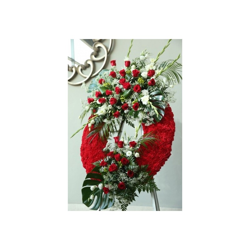 Majestuosa corona de flores naturales con dos cabeceros de rosas y aro principal de clavel. Perfecta para despedir a nuestro ser amado. Consulte sin compromiso la posibilidad de colores que tiene.