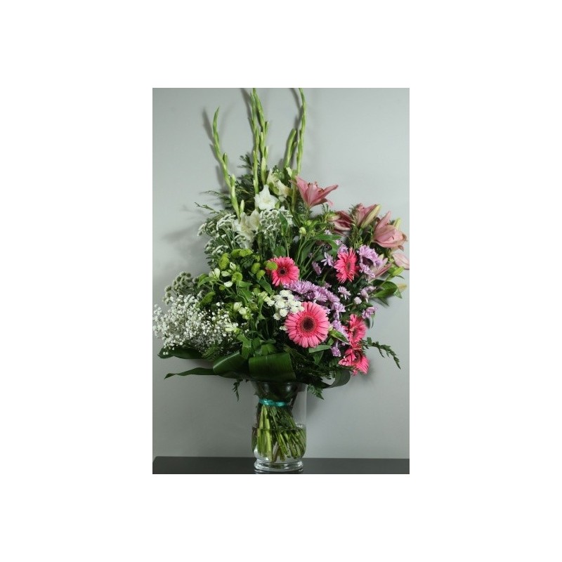 Ramo funebre de flores naturales variadas de temporada en tonos verdes, blancos y rosas. Este ramo simboliza la pureza y serenidad perfecta para despedir a un ser querido.