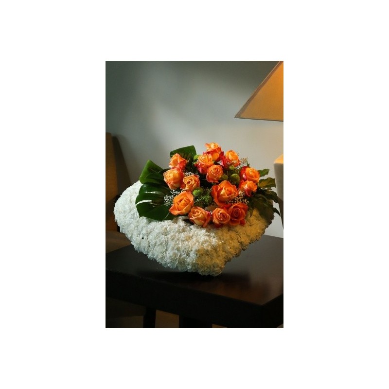 Corazón funebre de flores naturales en tonos blancos y naranjas. Una forma diferente de despedir a su ser querido. Escoje la tonalidad que tu escojas.