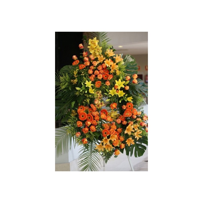Corona funeraria de flores naturales en tonos verdes y naranjas perfecta para despedir a un ser querido. Realizada con variedad de flores naturales como rosas, lirios y gerberas. El producto es personalizable, por lo que no dude en consultarno las posibilidades de colores que existen.