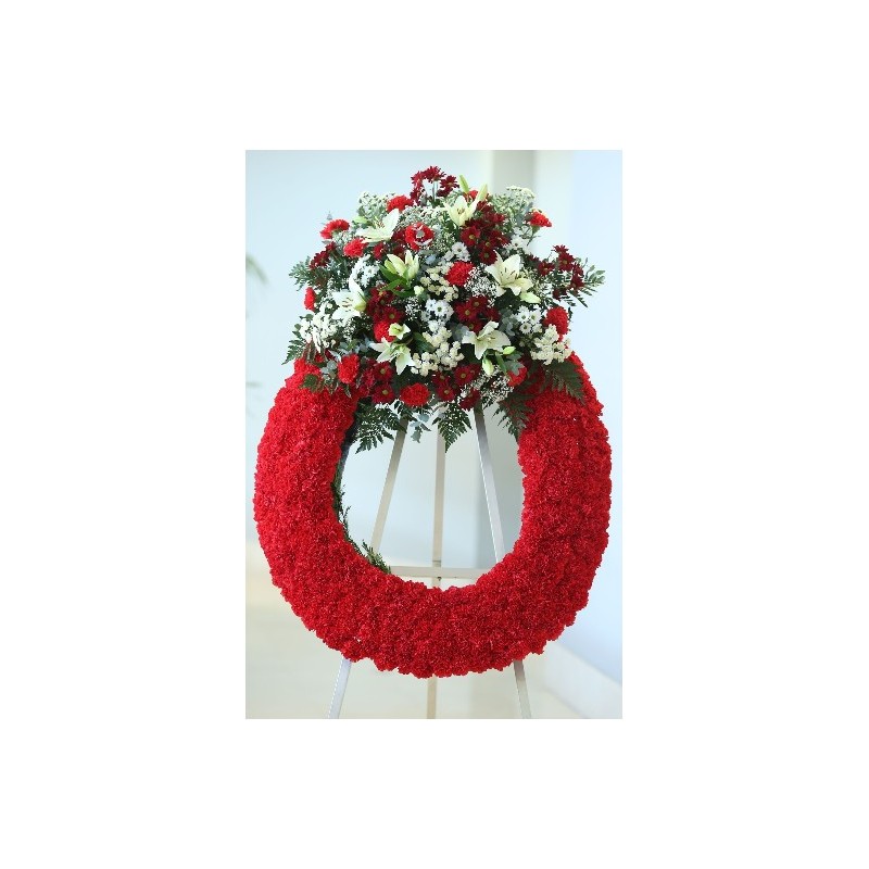 Corona de claveles (se puede cambiar la tonalidad de los mismos) con un adorno superior de liliums, crysantemum y solidago sobre hojas tropicales. De elegante elección cromática.