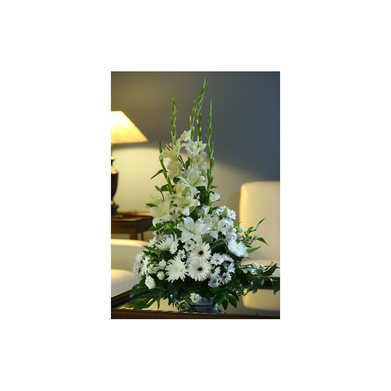 Centro de flor variada con mucha altura. Se puede confeccionar con lilium o gladiolos. Se puede realizar por encargo en otras tonalidades, tamaño y forma. Cosulta sin compromiso y te prepararemos un centro a medida para tu ser querido.