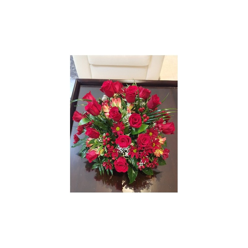 Centro de rosas, crisantemo, hipericum y verdes.Una pieza alegre y elegante para decir adiós a nuestros seres querido o recordarlos en un día especial. Consulte colores sin compromiso.