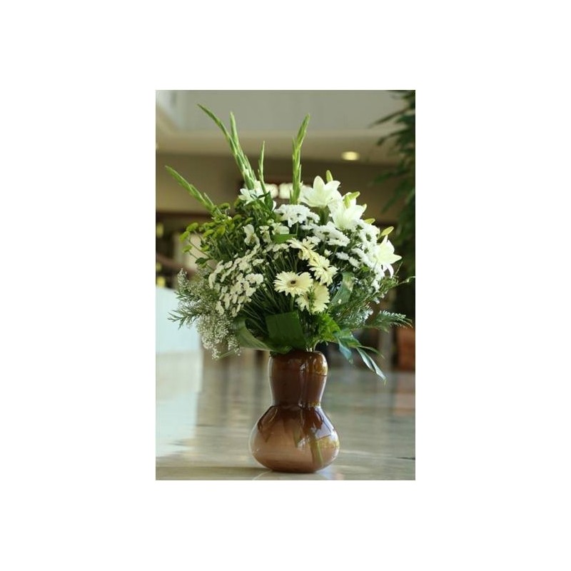 Ramo de flores blancas para despedir en un último adiós a nuestro ser querido. Esta pieza está elaborada con gladiolos, crisantemos, gerberas y lilium. se puede añadir una cinta con dedicatoria.
