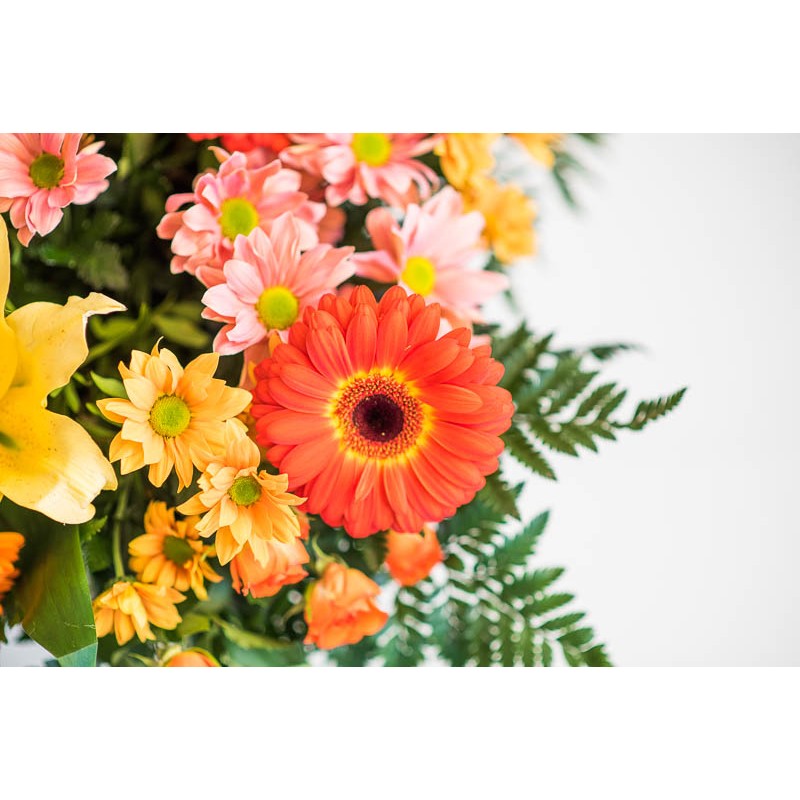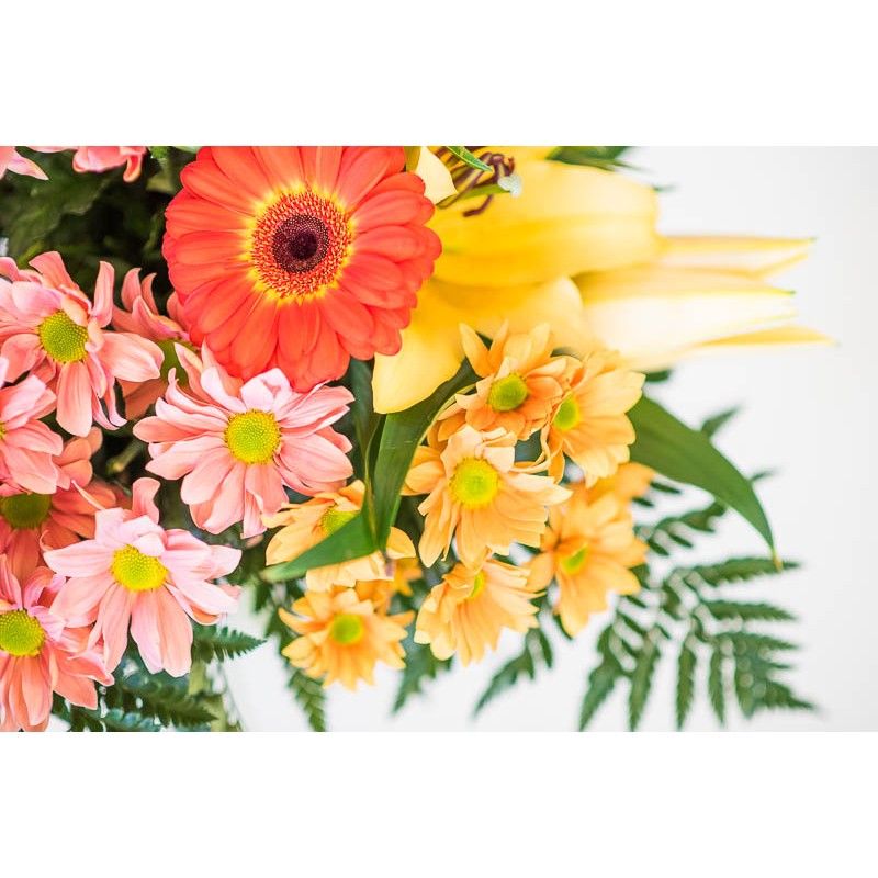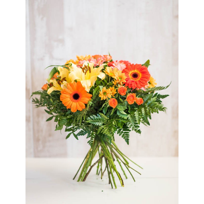 Sorprende con este ramo de colores anaranjados que recuerdan a la piel del melocotón. Rosas, lirios, crisantemos, gerberas y alstroemerias, componen este arreglo lleno de aroma y frescura. ¡Perfecto para sorprender a los amantes de este color!