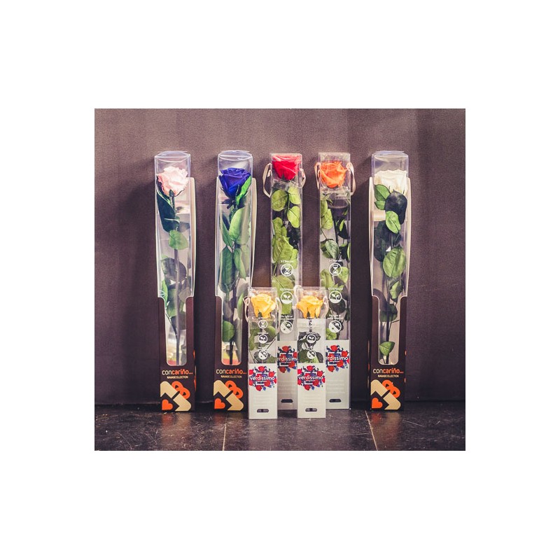 Preservadas de colores. Tamaño flor:4,5 a 6 cm diámetro, Altura:55,5 cm, Envoltorio Caja decorativa