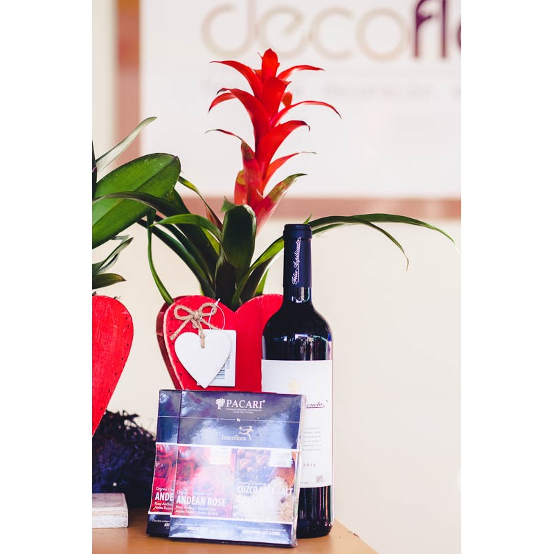 Composición de planta en base de madera con forma de corazón acompañado de vino y bombones.