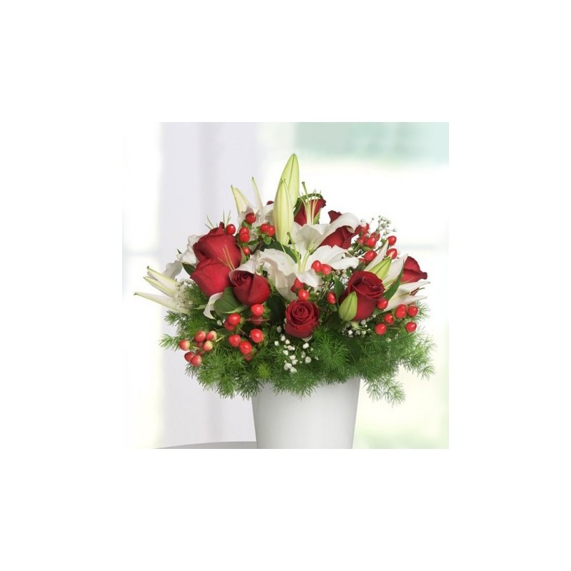 Precioso centro de lirios y rosas rojas preparado por especialistas en arte floral de Decoflor Toledo. Este tipo de centro son perfectos para regalar en cualquier ocasi importante a esa persona tan especial. La combinaci de los lirios y las rosas transmiten amor, tranquilidad y pasi.