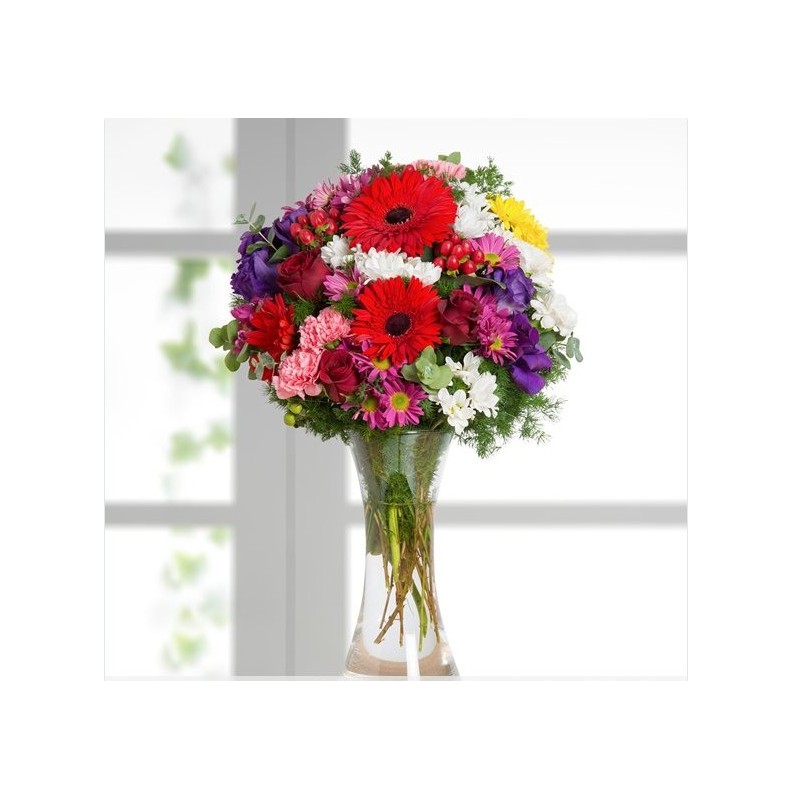 Espectacular ramo de flores naturales, claveles, gerberas y rosas. Un ramo perfecto para regalar en cualquier momento.