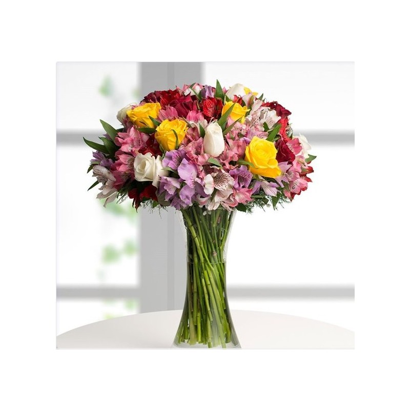 Ramos de alstromelias variadas y rosas multicolor. Un bouquet perfecto para regalar en el D de la Madre, San Valent, cumpleas, nacimientos o cualquier otra ocasi que desees vestir con flores. Su colorido y elegancia no pasan desapercibido. Este bouquet es un acierto asegurado para sorprender a esa persona tan especial. Los colores de las flores podr variar seg la disponibilidad o petici del cliente.