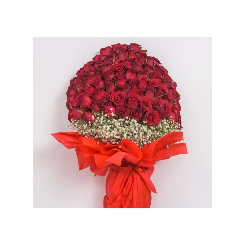 Ramo de 100 rosas rojas con verdes variados y paniculata. Una forma perfecta para de expresar tus sentimientos a esa pesona tan especial. En Decoflor solamente escogemos las flores más frescas para que se mantengan en perfecto estado durante más tiempo.